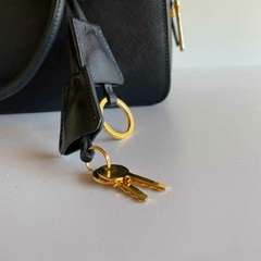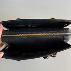 Modelo de cor preta, confeccionado em couro saffiano, com ferragens douradas. Possui alça de ombro longa removível e alça de mão, compartimento triplo com multiplos bolsos internos e fechamento principal por zíper. Apresenta leve descoloração e riscos nos metais. Acompanha dustbag da marca.